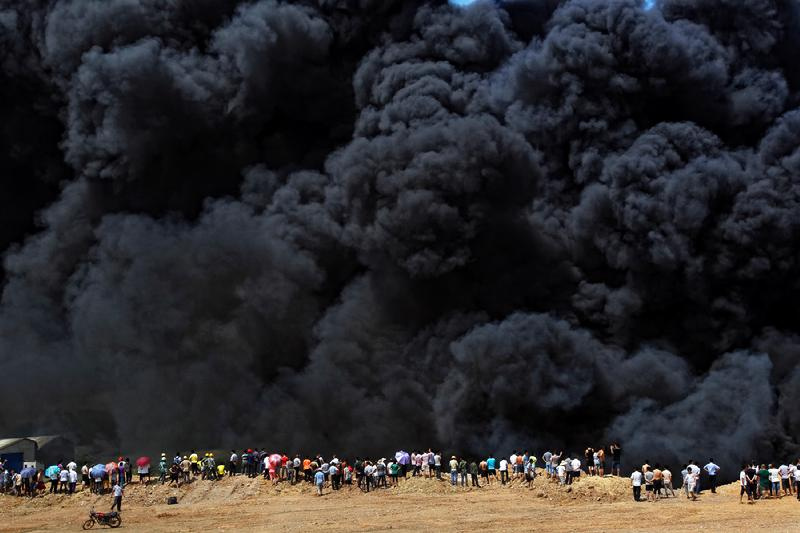 2013年7月2日,長(zhǎng)沙瀏陽河黃興大橋附近,兩個(gè)復(fù)合地板倉庫起火,火勢(shì)借著風(fēng)勢(shì)蔓延,冒出的滾滾黑煙,幾乎全城都看得到。華劍回憶,當(dāng)天他剛好從瀏陽出差回來,經(jīng)過高速收費(fèi)站時(shí)看到遠(yuǎn)處濃煙漫天。憑著職業(yè)敏感,他第一時(shí)間趕到現(xiàn)場(chǎng),拍下了這張圖片。