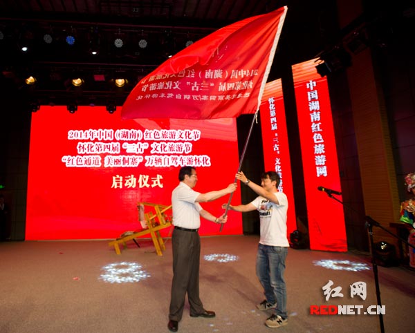 新聞發(fā)布會上,湖南省委常委、省委宣傳部部長許又聲為萬輛自駕車游活動授旗,啟動中國湖南紅色旅游網(wǎng)(http://hsly.rednet.cn/)。湖南省旅游局局長張值恒發(fā)布新聞,湖南省委宣傳部副部長、外宣辦主任周湘主持新聞發(fā)布會,懷化市市長李暉介紹懷化市情及相關(guān)旅游活動情況。出席新聞發(fā)布會的還有省政府副秘書長王光明,省旅游局副局長劉綿松,懷化市副市長楊開鳳,通道侗族自治縣委書記印宇鷹,中南傳媒董事、紅網(wǎng)黨委書記、董事長舒斌。